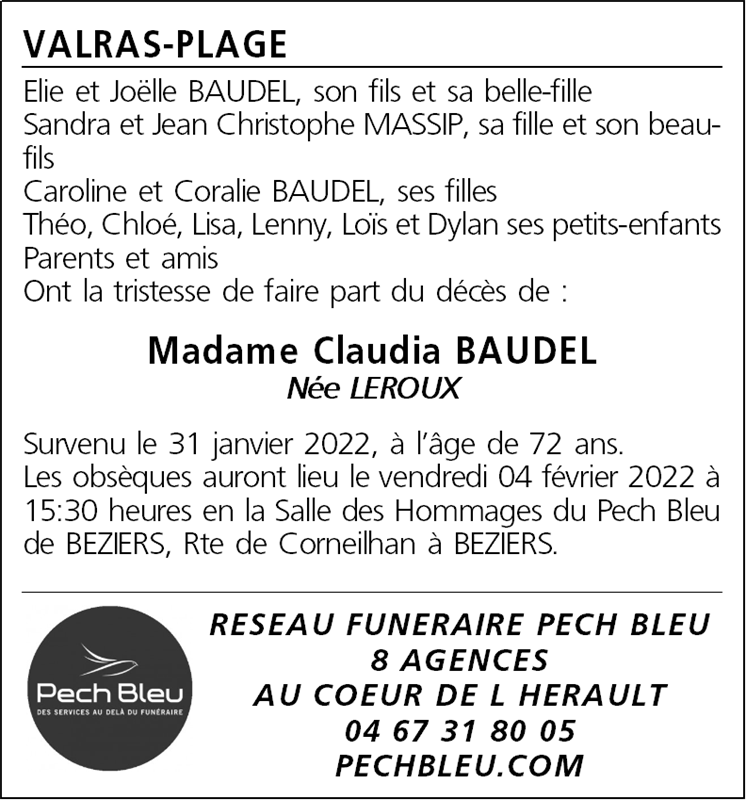 Décédée à Béziers (34500, France) le lundi 31 janvier 2022 à l'âge de 72 ans
