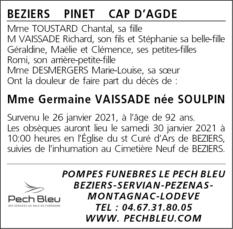 Décédée à Agde (34300, France) le mardi 26 janvier 2021 à l'âge de 92 ans