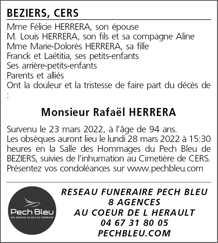 Décédé à Béziers (34500, France) le mercredi 23 mars 2022 à l'âge de 94 ans