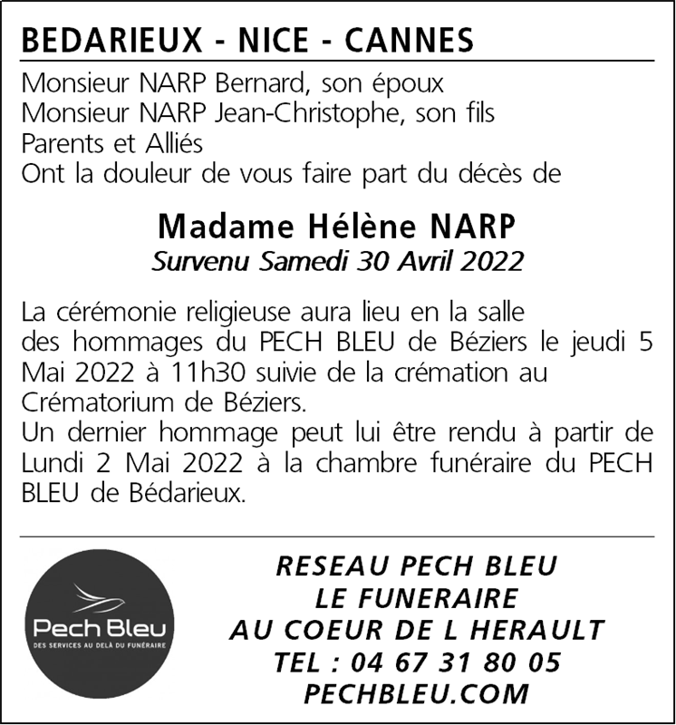 Décédée à Bédarieux (34600, France) le samedi 30 avril 2022 à l'âge de 91 ans