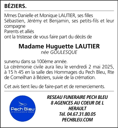 Décédée à Béziers (34500, France) le jeudi 24 avril 2025 à l'âge de 99 ans