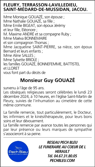 Décédé à Fleury d'Aude (11560, France) le mercredi 18 décembre 2024 à l'âge de 95 ans