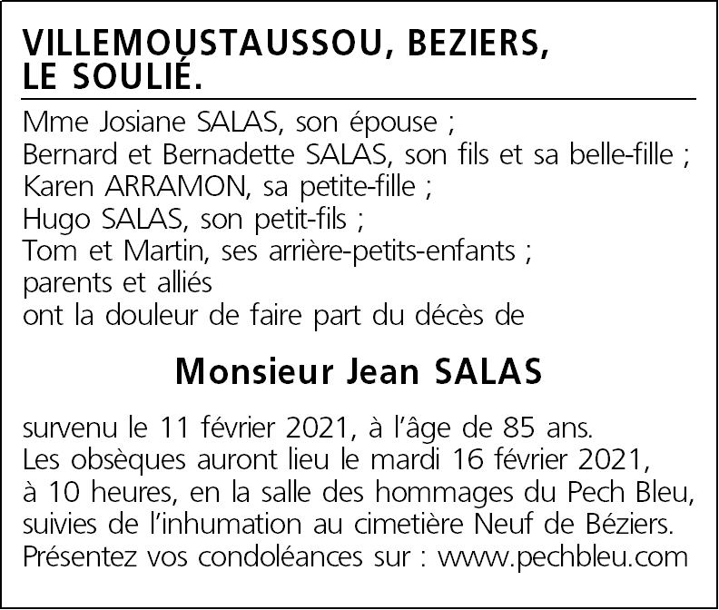 Décédé à Béziers (34500, France) le jeudi 11 février 2021 à l'âge de 85 ans