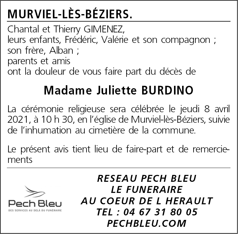 Décédée à Murviel-lès-Béziers (34490, France) le samedi 3 avril 2021 à l'âge de 82 ans
