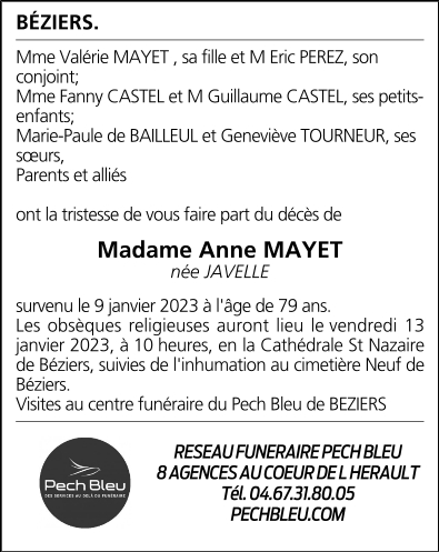 Décédée à Béziers (34500, France) le lundi 9 janvier 2023 à l'âge de 79 ans