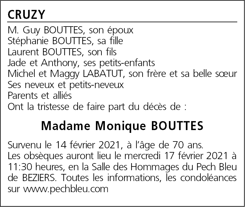Décédée à Béziers (34500, France) le dimanche 14 février 2021 à l'âge de 70 ans