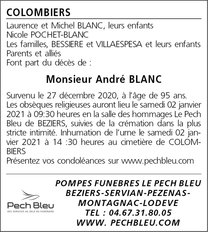 Décédé à Béziers (34500, France) le dimanche 27 décembre 2020 à l'âge de 95 ans