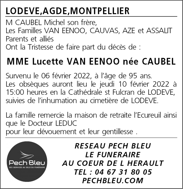 Décédée à Lodève (34700, France) le dimanche 6 février 2022 à l'âge de 95 ans