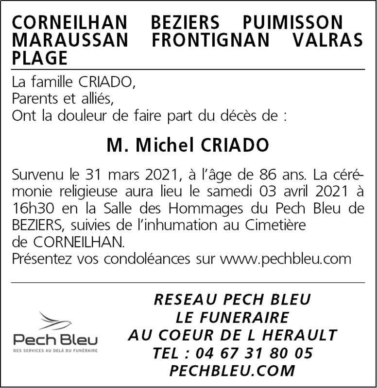 Décédé à Béziers (34500, France) le mercredi 31 mars 2021 à l'âge de 86 ans