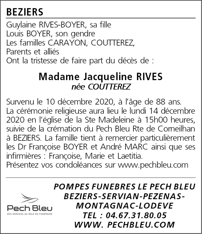 Décédée à Boujan-sur-Libron (34760, France) le jeudi 10 décembre 2020 à l'âge de 88 ans