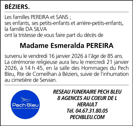 Décédée à Béziers (34500, France) le vendredi 16 janvier 2026 à l'âge de 85 ans