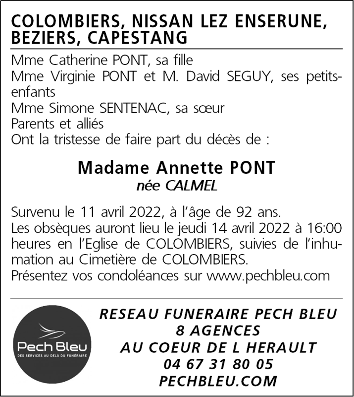 Décédée à Boujan-sur-Libron (34760, France) le lundi 11 avril 2022 à l'âge de 92 ans