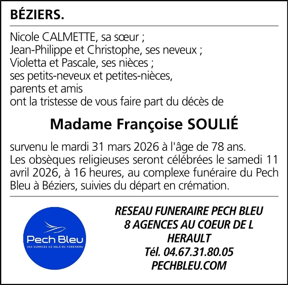 Décédée à Béziers (34500, France) le mardi 31 mars 2026 à l'âge de 78 ans