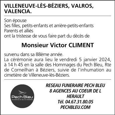 Décédé à Béziers (34500, France) le vendredi 29 décembre 2023 à l'âge de 87 ans
