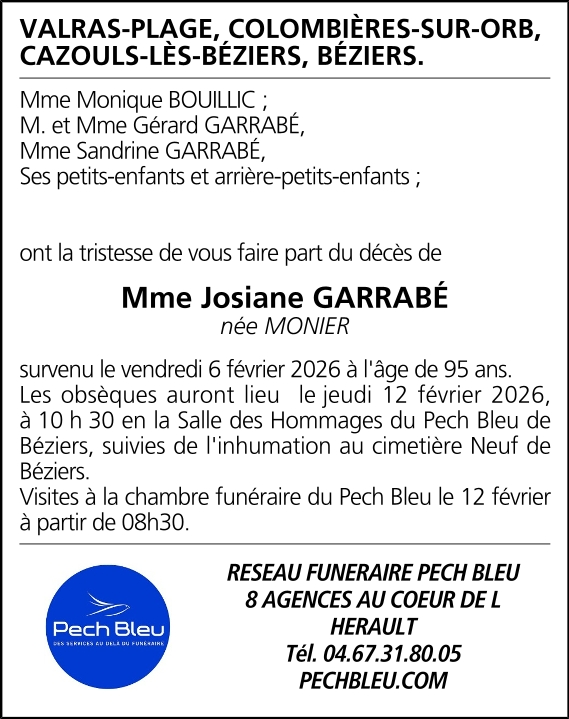 Décédée à Béziers (34500, France) le vendredi 6 février 2026 à l'âge de 95 ans